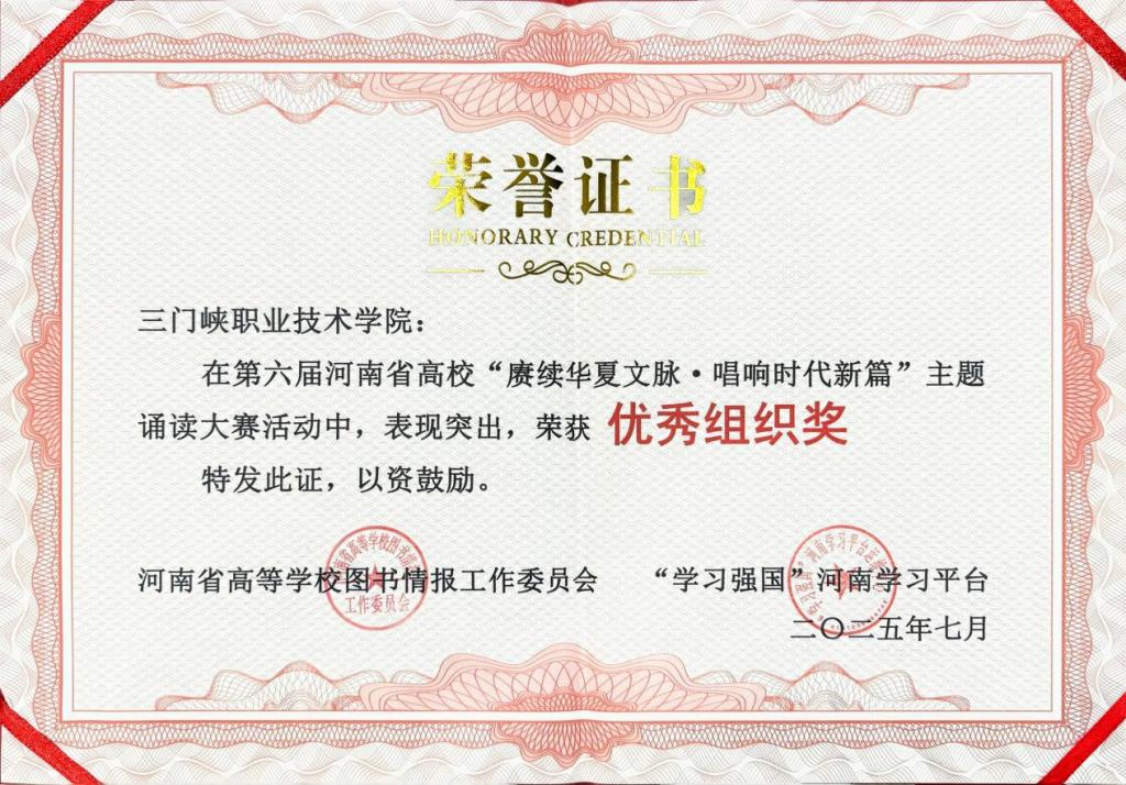 在第六届河南省高校“赓续华夏文脉·唱响时代新篇”主题诵读大赛中,我院图书馆凭借出色的组织工作、广泛的师生参与及显著的育人成效,荣获大赛“优秀组织奖”殊荣。