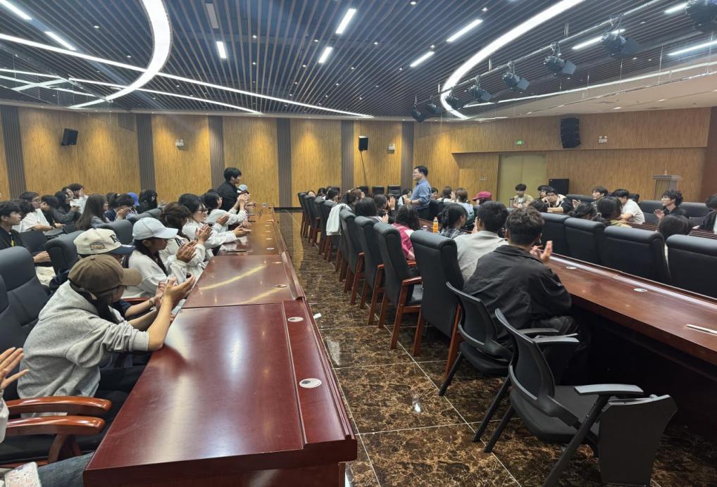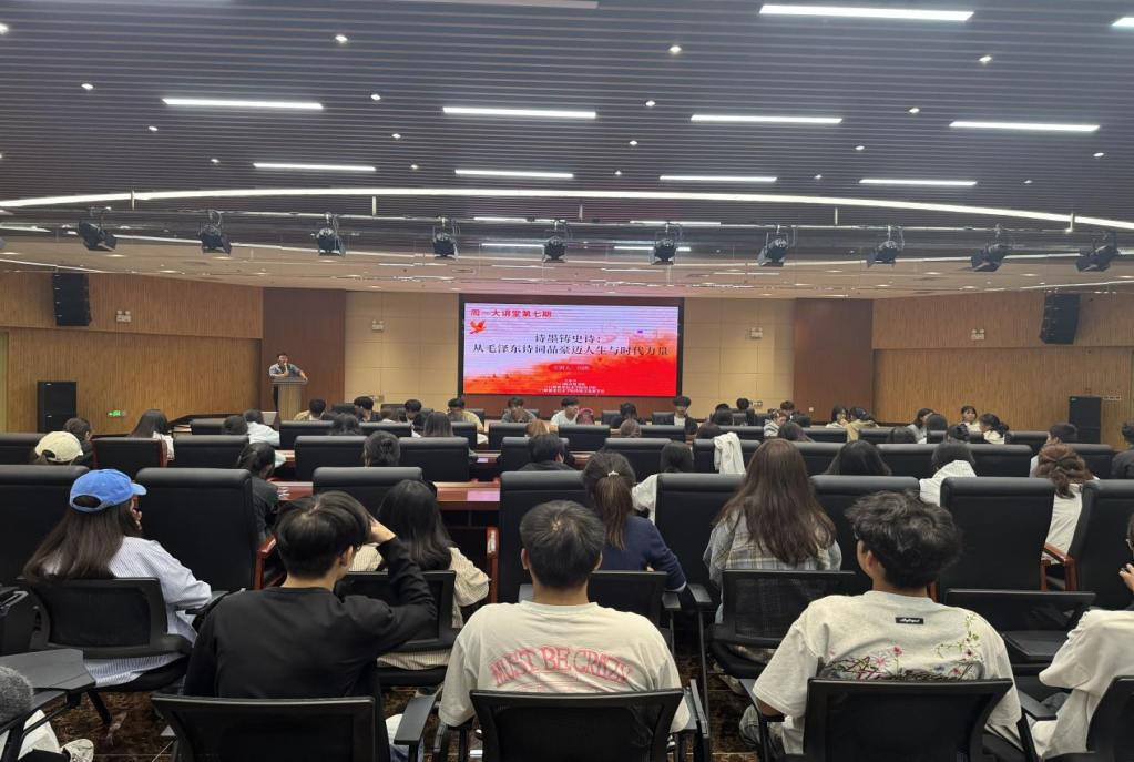 闫涛老师以毛泽东诗词创作历程为主线,从“诗脉绵延”“诗史同辉”“诗心传承”三大篇章展开讲解,结合丰富的历史实例,生动阐释了诗词中的革命情怀与精神内涵。讲解到高潮时,闫老师现场激情诵读《沁园春·长沙》,引起全场共鸣,掌声雷动。最后,闫老师同在场学生探讨了如何从诗词中汲取理想力量、培育斗争精神、厚植家国情怀,同学们积极发言,抒发见解,氛围热烈。