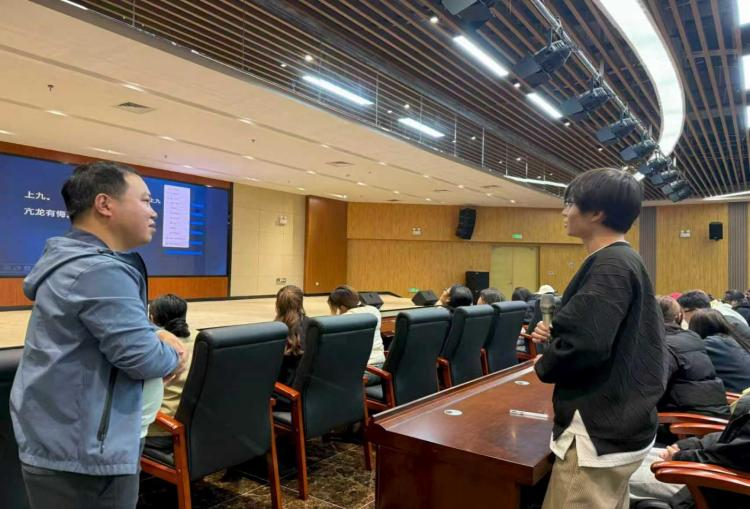 在互动环节,同学们踊跃提问,就自身在学业、规划等方面的困惑与老师探讨。王艳成老师逐一回答同学们的问题并引导大家将乾卦智慧转化为个人专属的“行动方案”,现场气氛热烈。