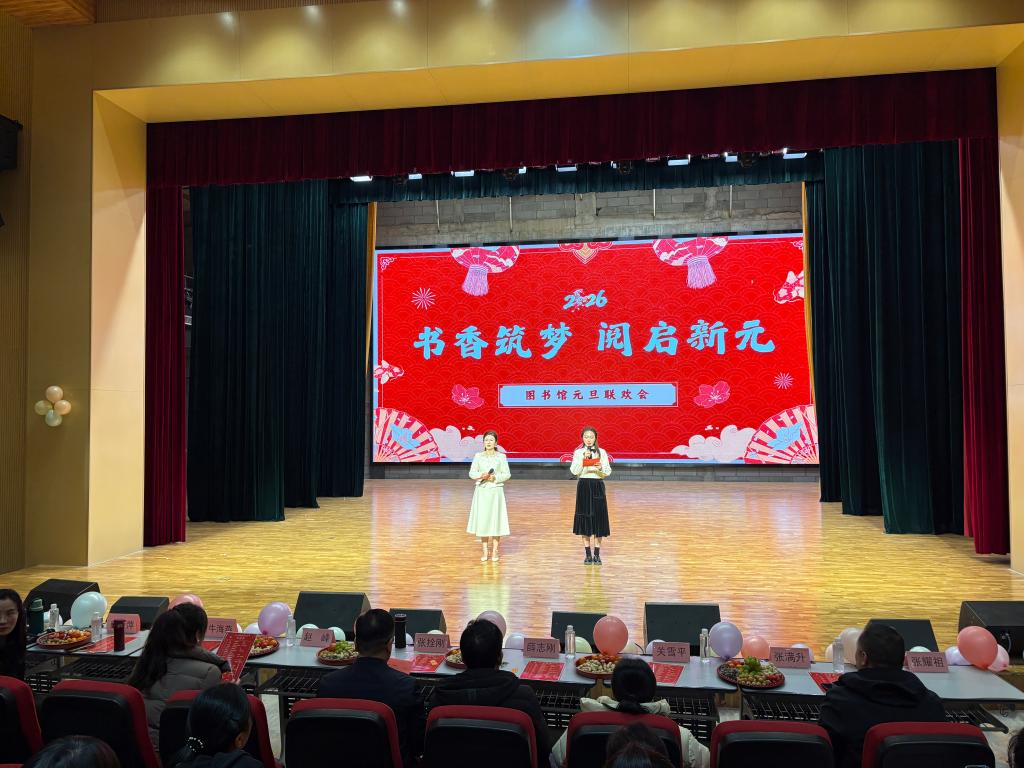 12月31日下午,图书馆内暖意融融、笑语盈盈,“书香筑梦·阅启新元”2026元旦联欢会在活动中心隆重举行。工会副主席薛志刚,纪检监察室负责人关雪平及全体馆员和学生代表齐聚一堂,以精彩的文艺演出共贺新年。