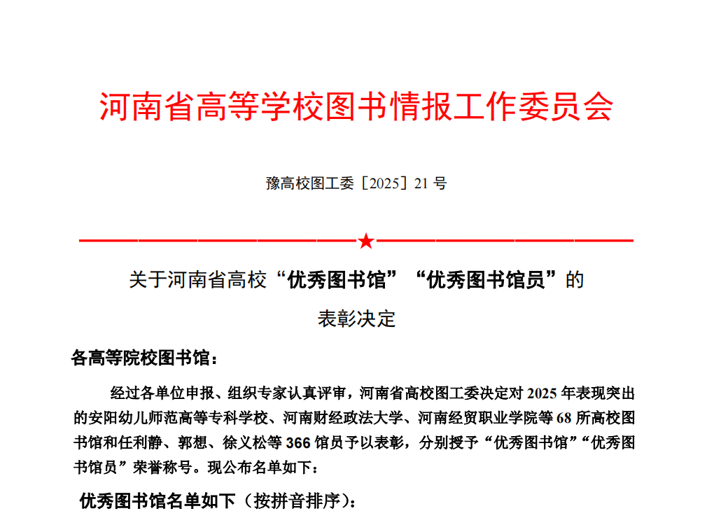 近日,河南省高等学校图书情报工作委员会公布了2025年度评优结果,三门峡职业技术学院图书馆获评河南省高校“优秀图书馆”。