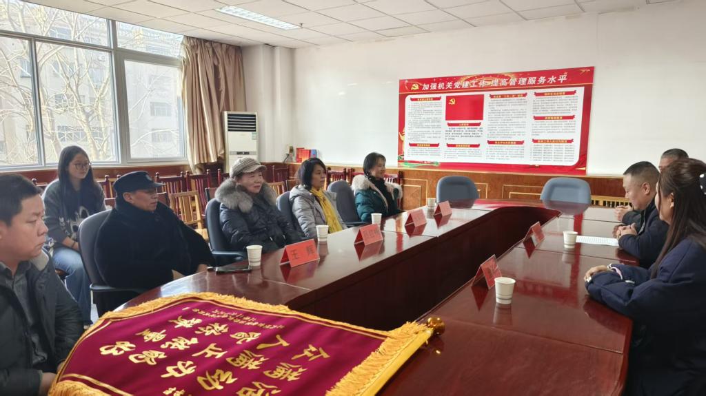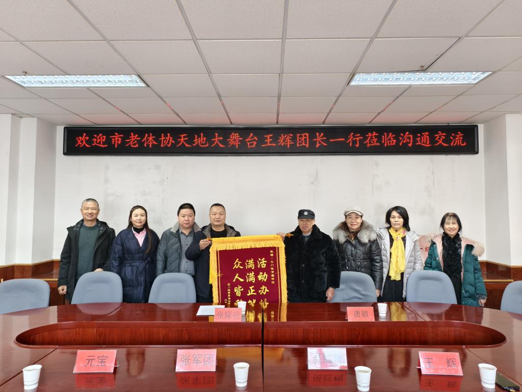 1月6日上午,市老年体育协会天地大舞台团长王辉一行四人莅临图书馆,向我馆赠送锦旗,以致谢图书馆为老年群体文化活动提供的优质平台和鼎力支持。副馆长张耀祖热情接待,并代表图书馆接过印着“活动办得好,满满正能量,众人皆称赞”的锦旗。