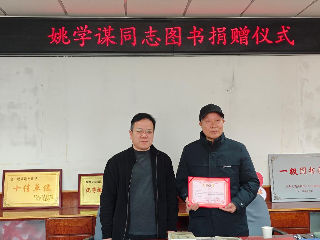 2026年1月13日上午,图书馆在二楼会议室隆重举行姚学谋同志图书捐赠仪式。河南省姚姓暨姚崇文化研究会会长、三门峡文史学者姚学谋,将个人编著、主编的29册珍贵文献无偿捐赠予我馆,尽显桑梓情怀与文化担当。党总支书记张拴刚代表馆方向姚学谋同志表示诚挚的感谢并分享感悟。