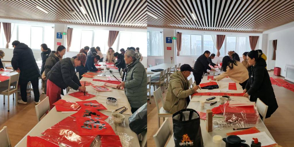 活动首日,图书馆大厅内墨香四溢,红纸铺展,充满了浓浓的年味。来自学院书画院的老师与老年大学书法爱好者组成的书写团队,现场挥毫泼墨,笔走龙蛇,将美好的新年祝福凝于笔端。一行行遒劲有力的书法,一句句吉祥如意的词句,为即将到来的春节增添了浓厚的文化气息。