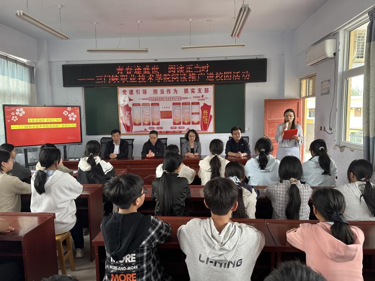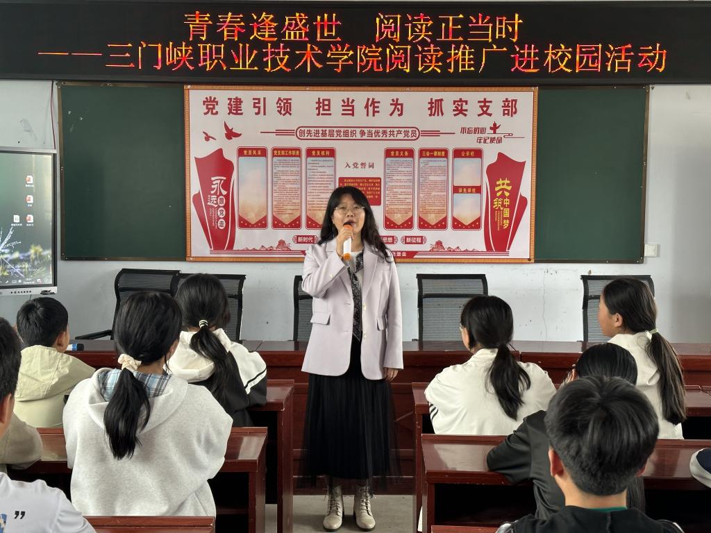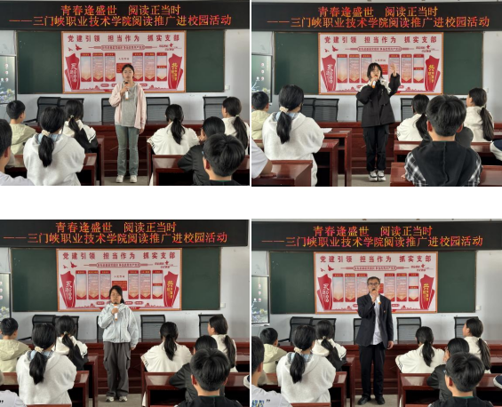 活动在主持人热情洋溢的开场致辞中拉开帷幕。图书馆党总支书记张拴刚宣读阅读倡议书,号召师生将阅读融入日常,让书香浸润校园。在师生经典诵读展示环节,温如雪、张玉茹、任怡香三位同学分别诵读了《曹刿论战》《将进酒》《爱莲说》等经典篇目,任玉成、杨喜娟两位老师深情演绎《出师表》与《水调歌头·明月几时有》,为学生们树立了良好榜样。